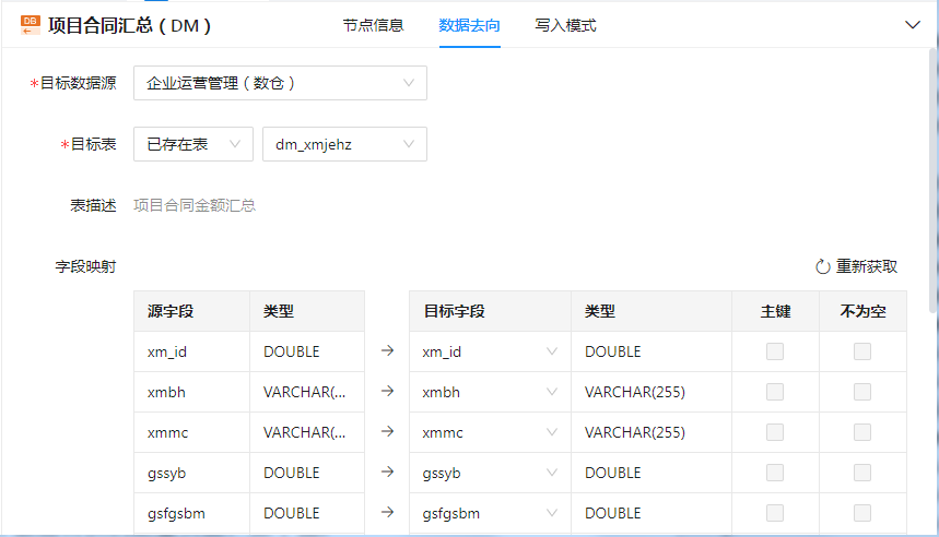配置同“数据同步”组件中对应功能,“”数据去向”详细说明请参见文档:数据同步-数据去向,“写入模式”详细说明请参见文档:数据同步-写入模式。