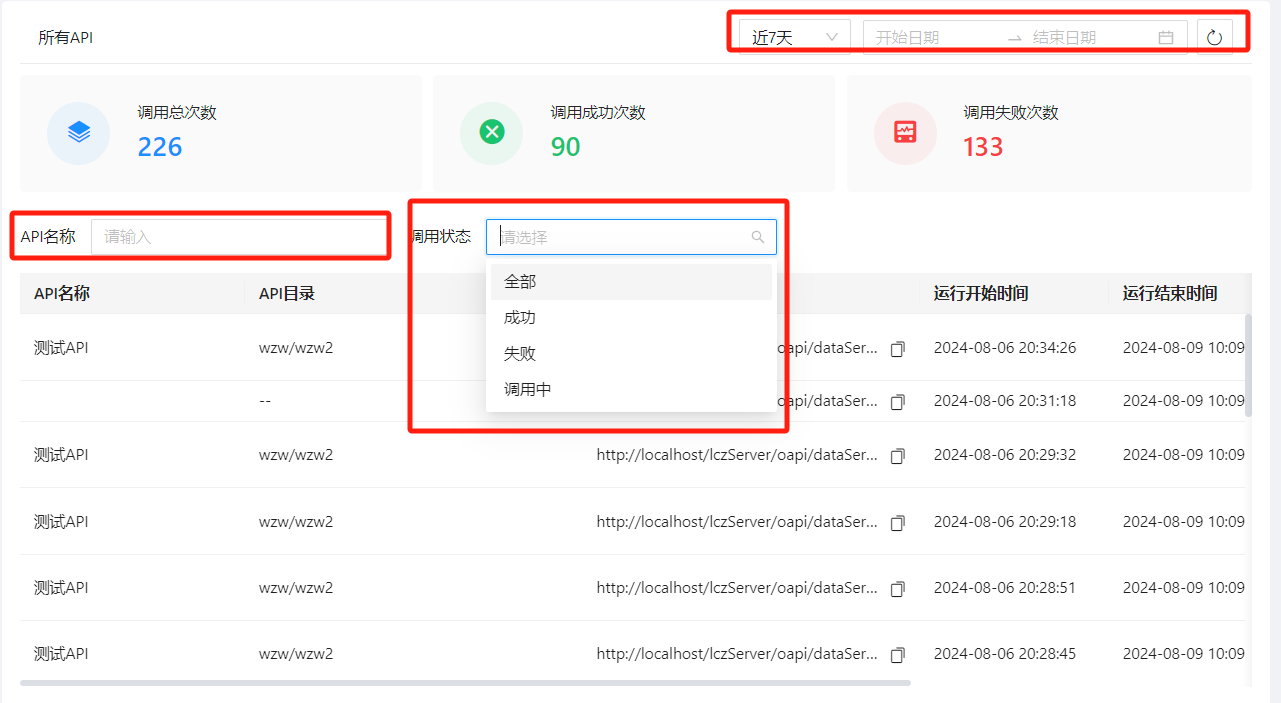 按照 API 被调用的时间进行时间区间筛选,同时可以按照 API 调用状态进行筛选,查看 API 情况,如下图所示:
