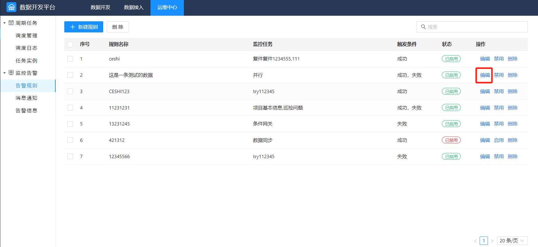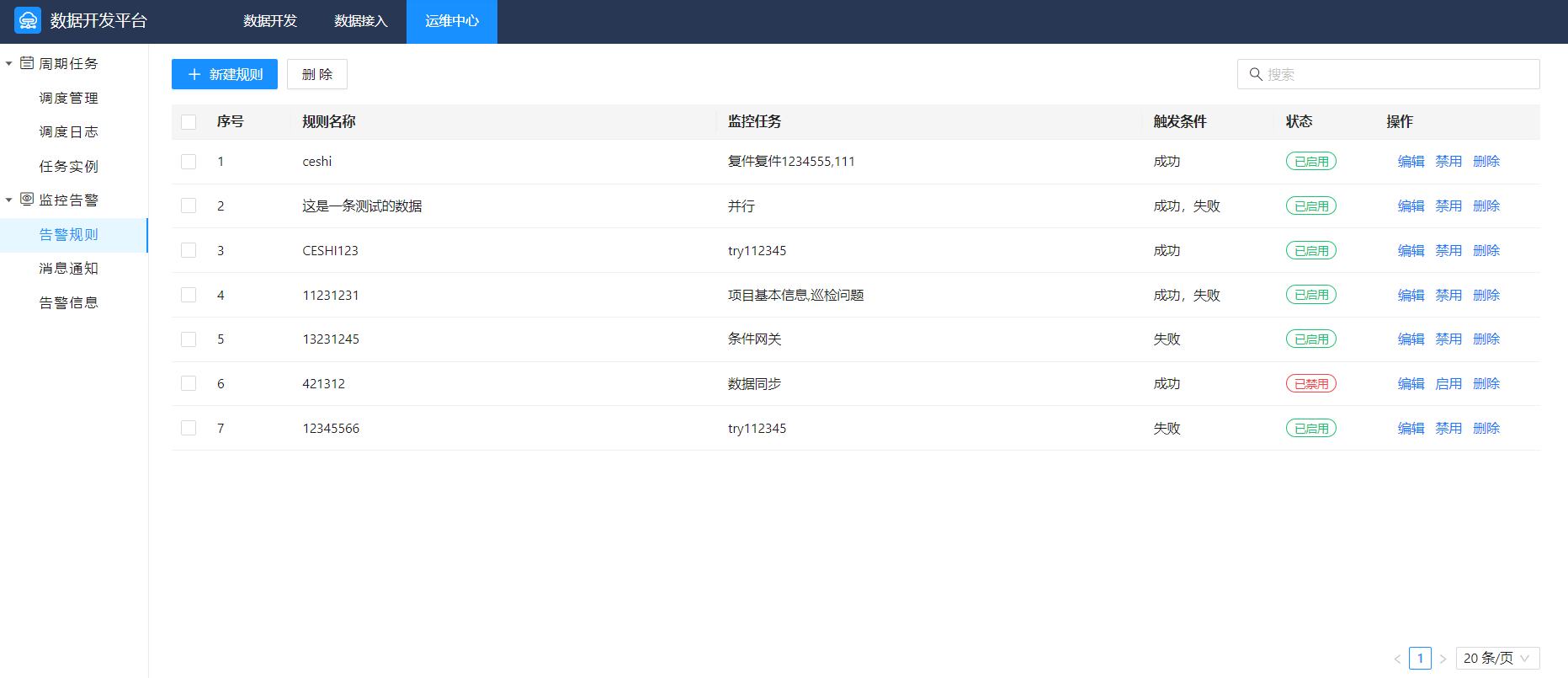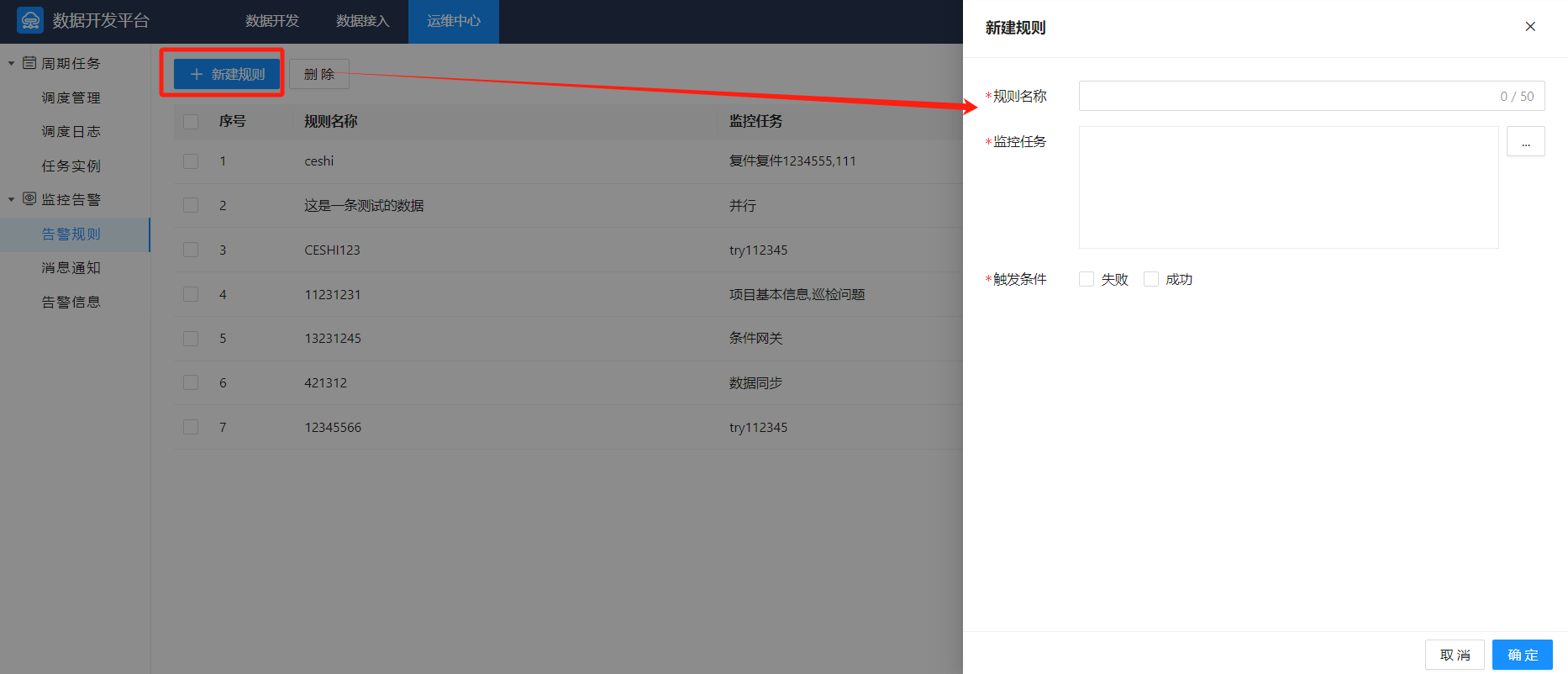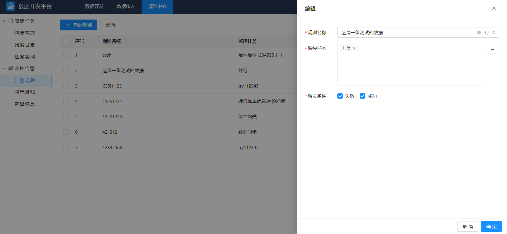 当任务执行成功或失败时,乐创者平台提供告警规则配置功能。用户也可自定义规则,定义告警触发条件。如下图所示: