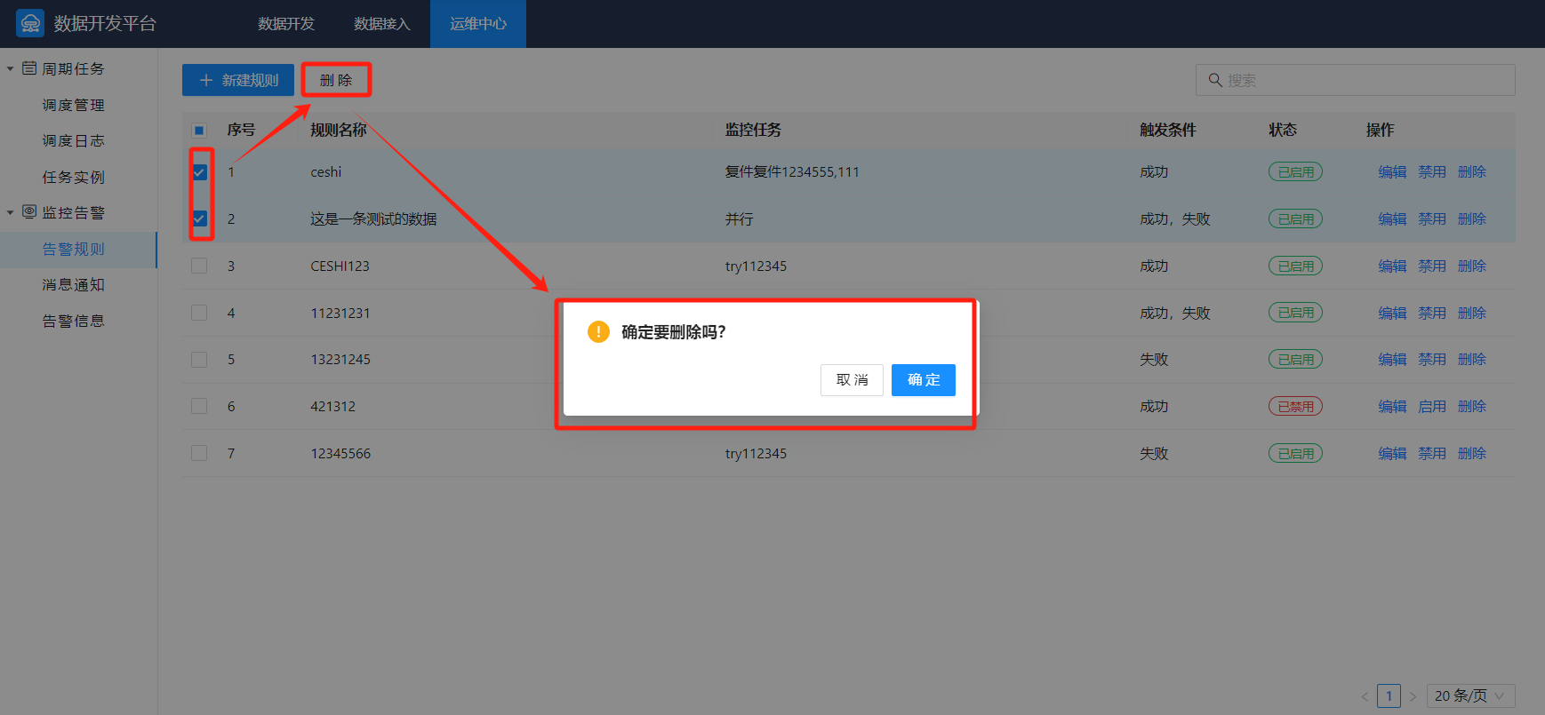 批量删除:勾选所需删除的规则,点击「删除」按钮,确定后即可批量删除。如下图: