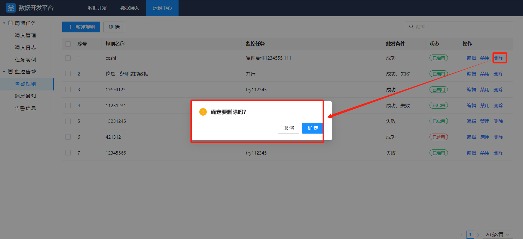 单个删除:可点击「删除」按钮,即可删除本条告警的规则。如下图: