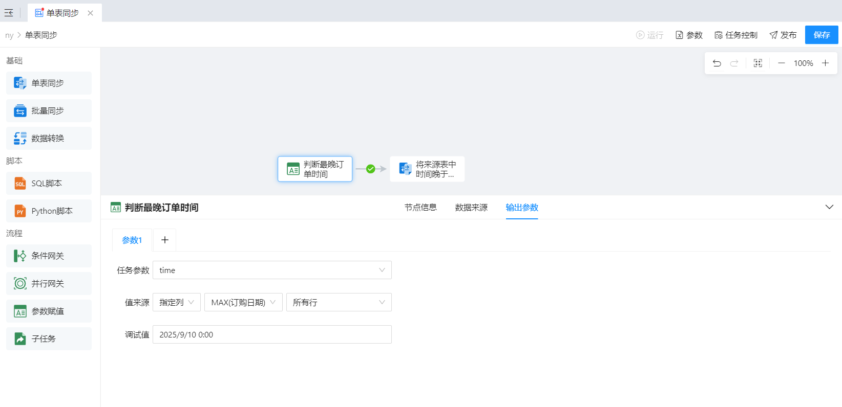 1.使用「参数赋值」节点,取出目标表中「订购时间」的最大值,将其设置为 time 参数。如下图所示: