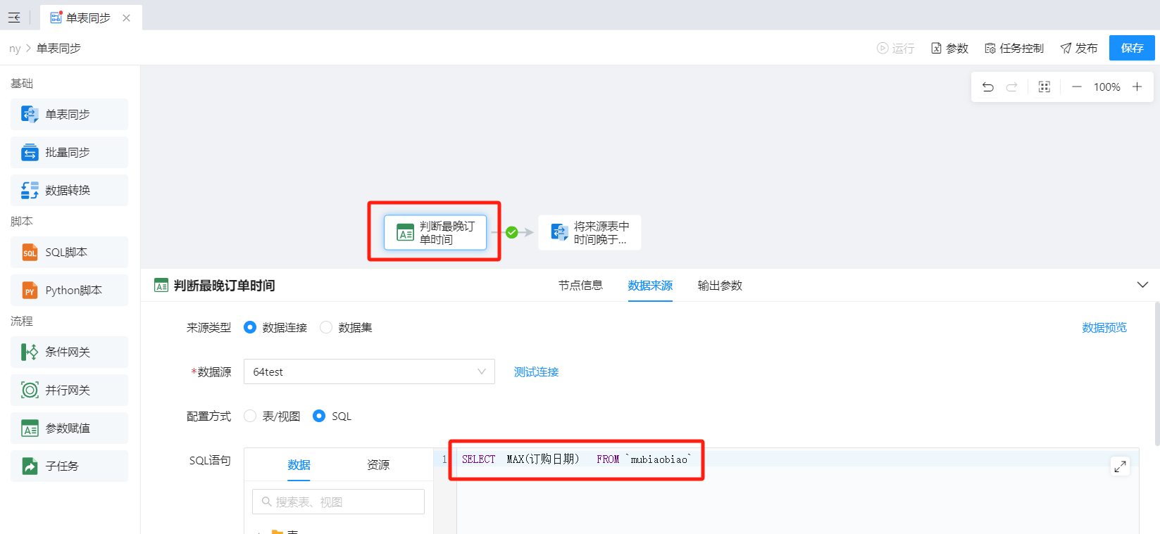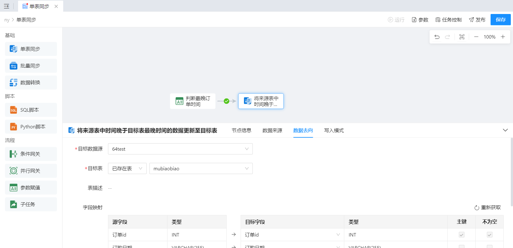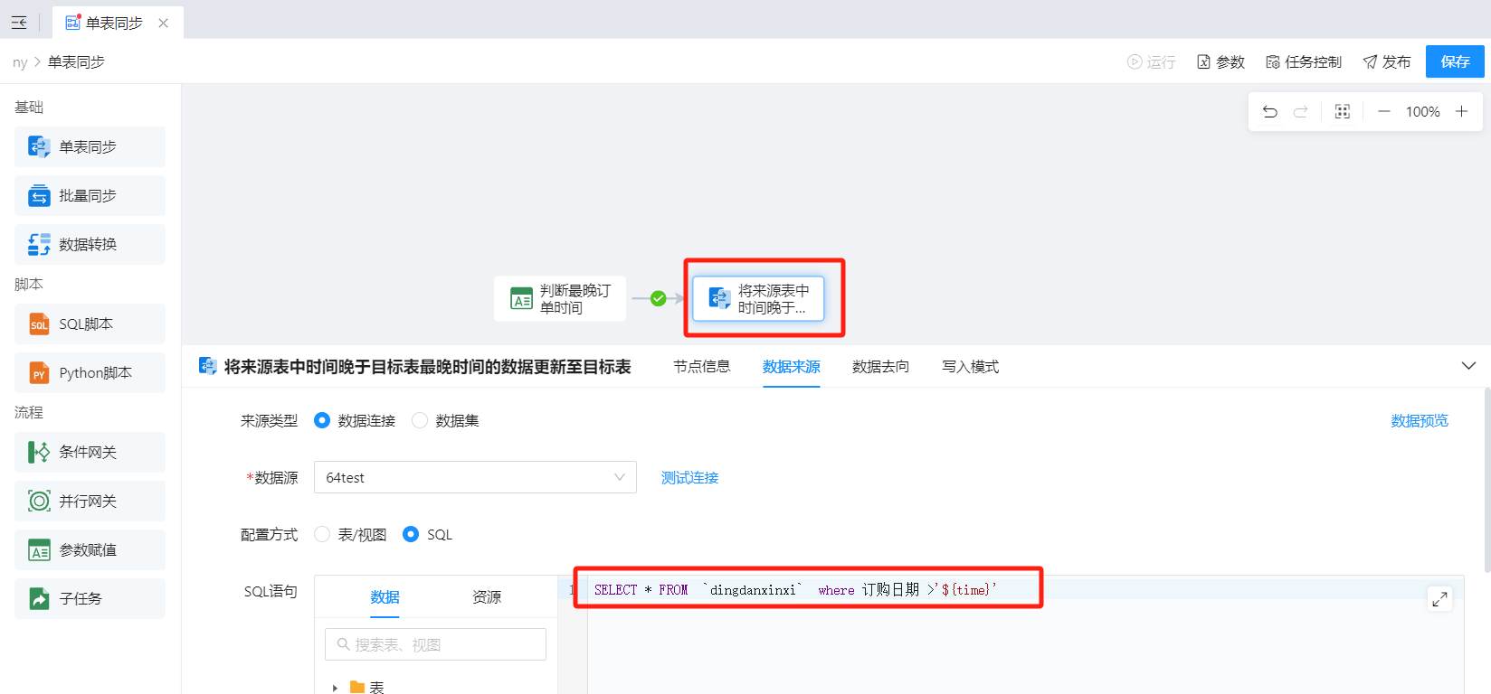 2.将新增的数据更新至目标表中。拖入一个「数据同步」节点,与「参数赋值」节点相连。「数据同步」节点中,将来源表「订单生成时间」大于 time 参数的数据取出,同步到目标表中。如下图所示: