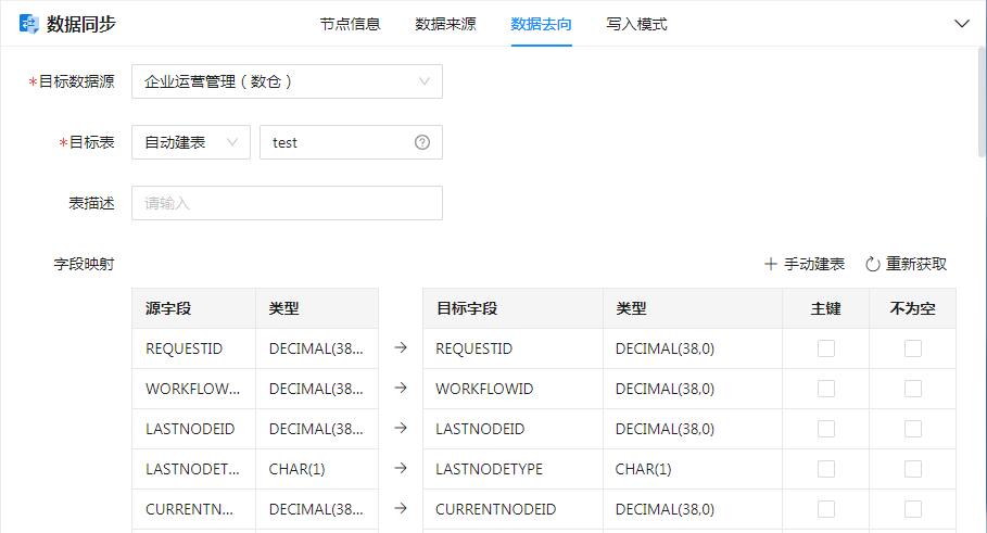 “数据同步”节点通过定义数据来源、数据去向、写入模式,可快速完成数据的同步。