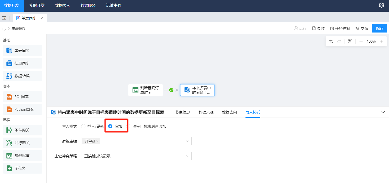 数据的增量同步 | 与参数配合使用,实现数据的增量同步。如,订单的实时更新,若目标表中「订单生成时间」的最大值,小于来源表的「订单生成时间」,说明来源表存在新增数据,需要将新增数据同步到目标表中。 |