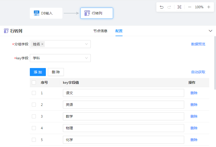 1)添加【行转列】组件,使用线条跟它的上游【DB输入】节点相连。