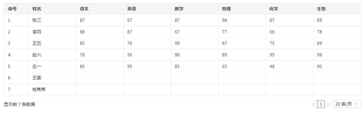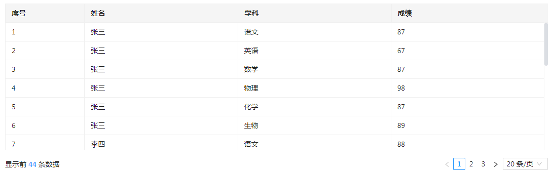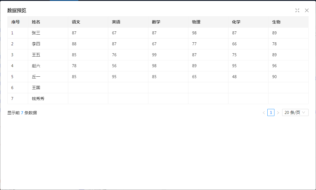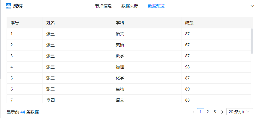 希望数据能够将一维表转换成二维表数据,按照姓名以及各学科成绩进行展示。如下图所示: