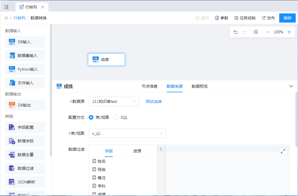 2)添加【DB输入】组件,命名为“成绩”,选择“x_cj1”表,配置如下图: