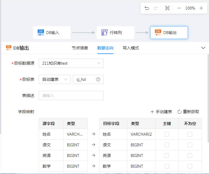 添加【DB输出】节点与【行转列】节点连接,配置“数据去向”将处理后的数据输出至指定的数据库中。如下图所示: