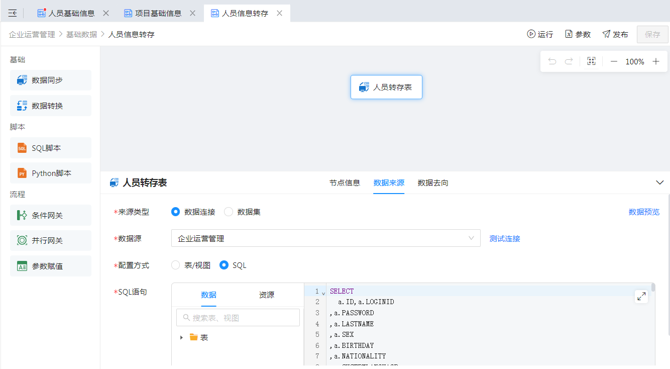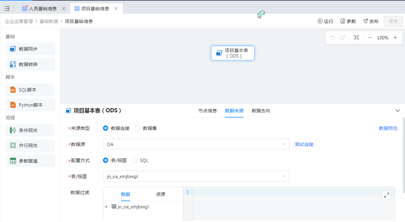 企业运营管理案例中需要用到一些基础数据,包括:人员基础信息、项目基础信息、人员信息转存,这些基础信息一般建议单独进行维护,方便不同业务场景进行使用。