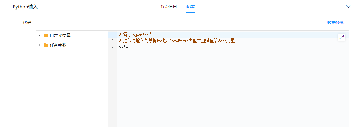 步骤一:代码配置 | 在代码编辑框中输入Python代码。 |
