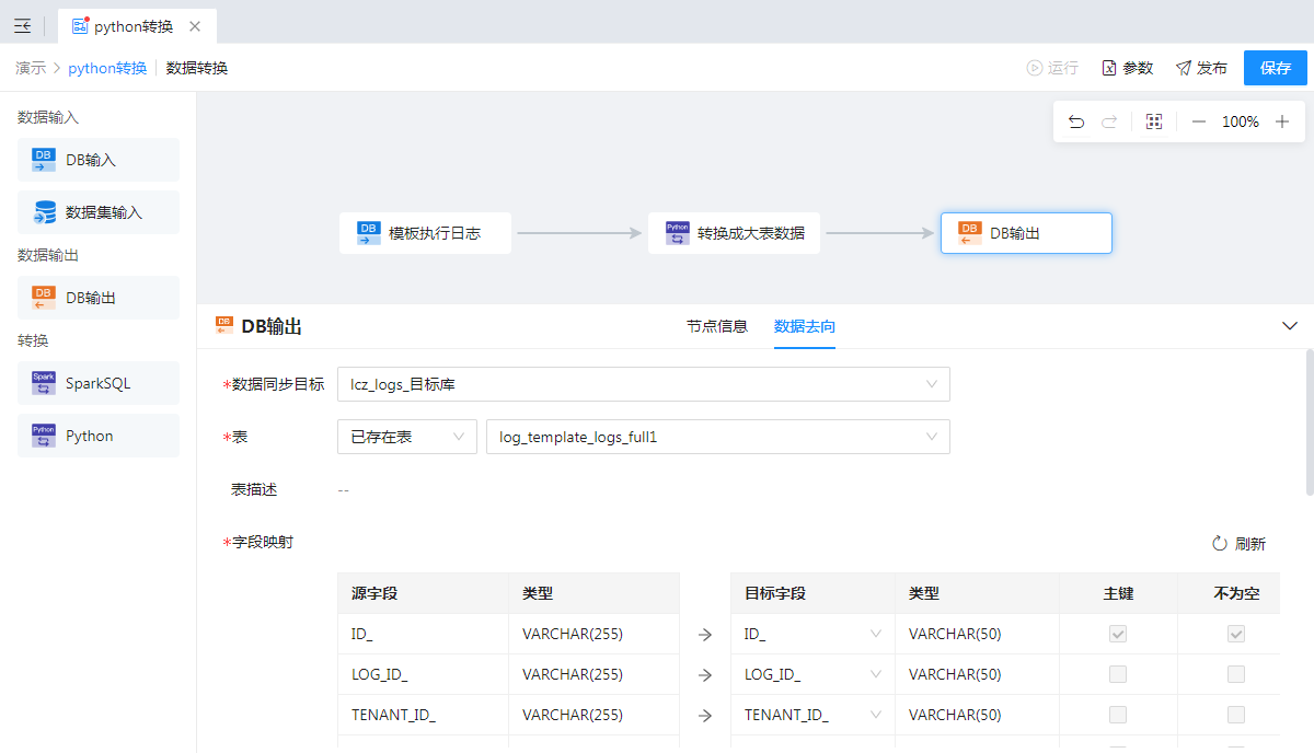 添加【DB输出】节点与【Python】节点连接,配置“数据去向”将处理后的数据输出。如下图所示: