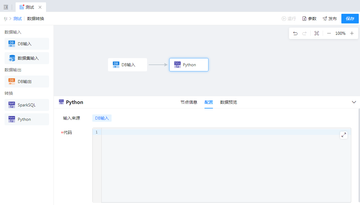【Pyhon】节点支持的功能包括:SQL语句和数据预览。与【SparkSQL】类似,这里不再重复介绍,不同的是:代码中需要编写Pyhon脚本。