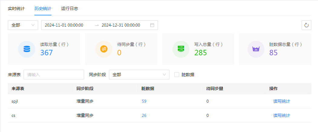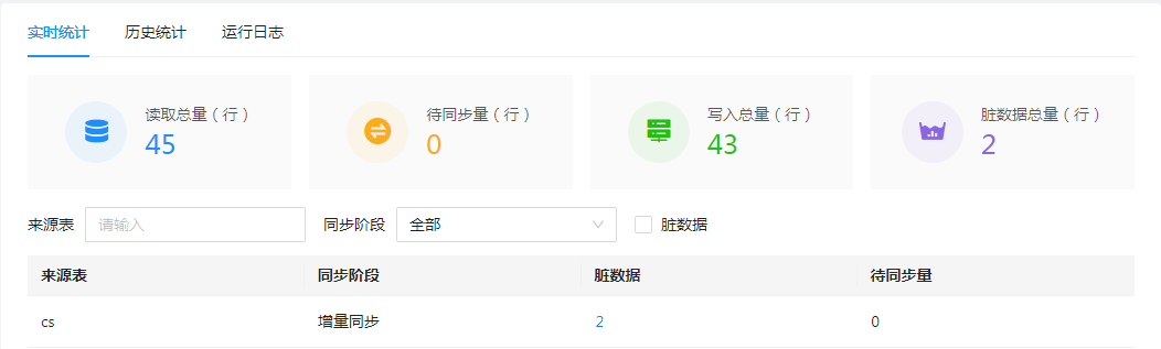 “实时统计”可查看当前任务目前实时同步情况,并定时实时刷新最新数据,汇总的数据是自任务启动后至今的累加数据,包括:读取总量(行)、待同步量(行)、写入总量(行)、脏数据总量(行)。