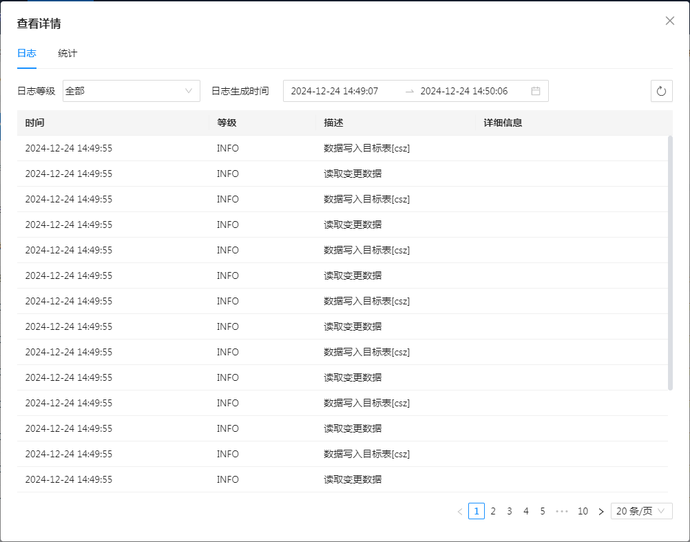可点击已启动过的任务,查看当前任务的同步详情(实时统计和历史统计)、运行日志: