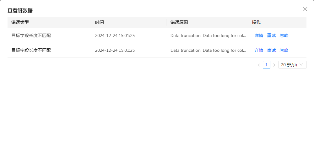如果表数据同步的过程中产生了脏数据,则点击脏数据数量可产生脏数据的原因,如下图:
