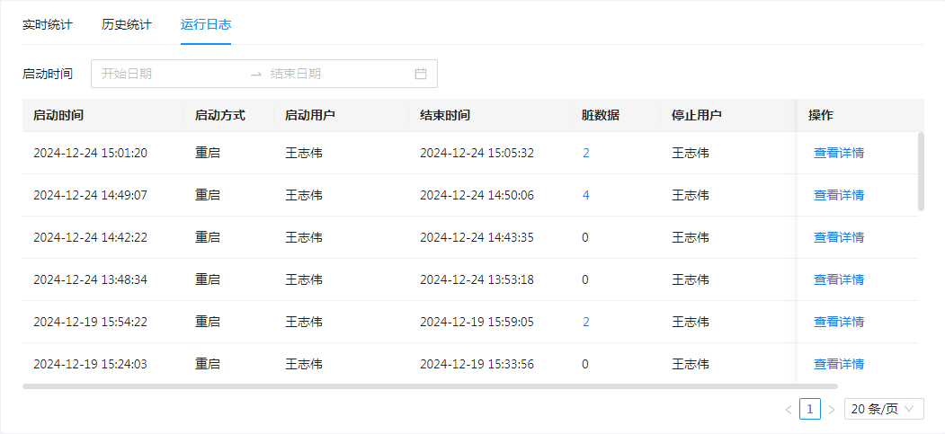 运行日志主要用于记录用户对该任务的操作记录,每启动一次任务就会产生一天记录,即生成一个版本。