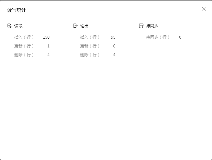 “读写统计”统计的是对应时间段内当前表的读写明细,包括:读取、输出和待同步情况,分为插入(行)、更新(行)、删除(行)的明细数据。