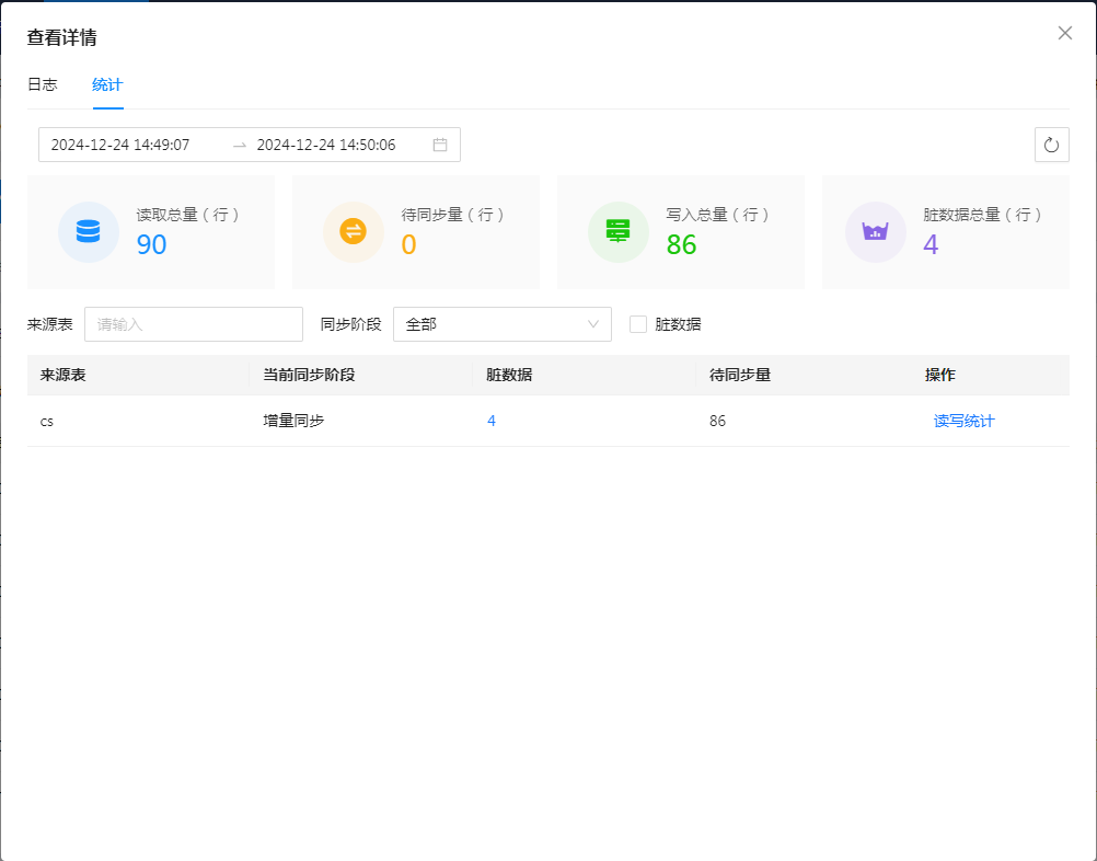 下方列表显示对应时间段内产生数据同步日志的表,并显示对应表的同步详情,包括:同步阶段(当前查询时间段最后时间节点所属的同步阶段)、脏数据、待同步量、读写统计。
