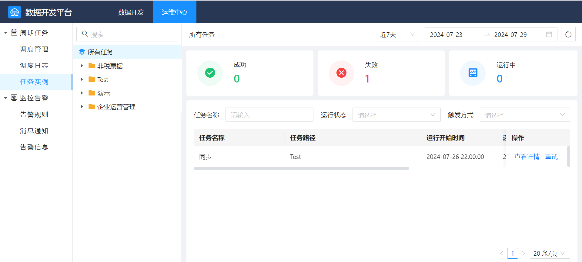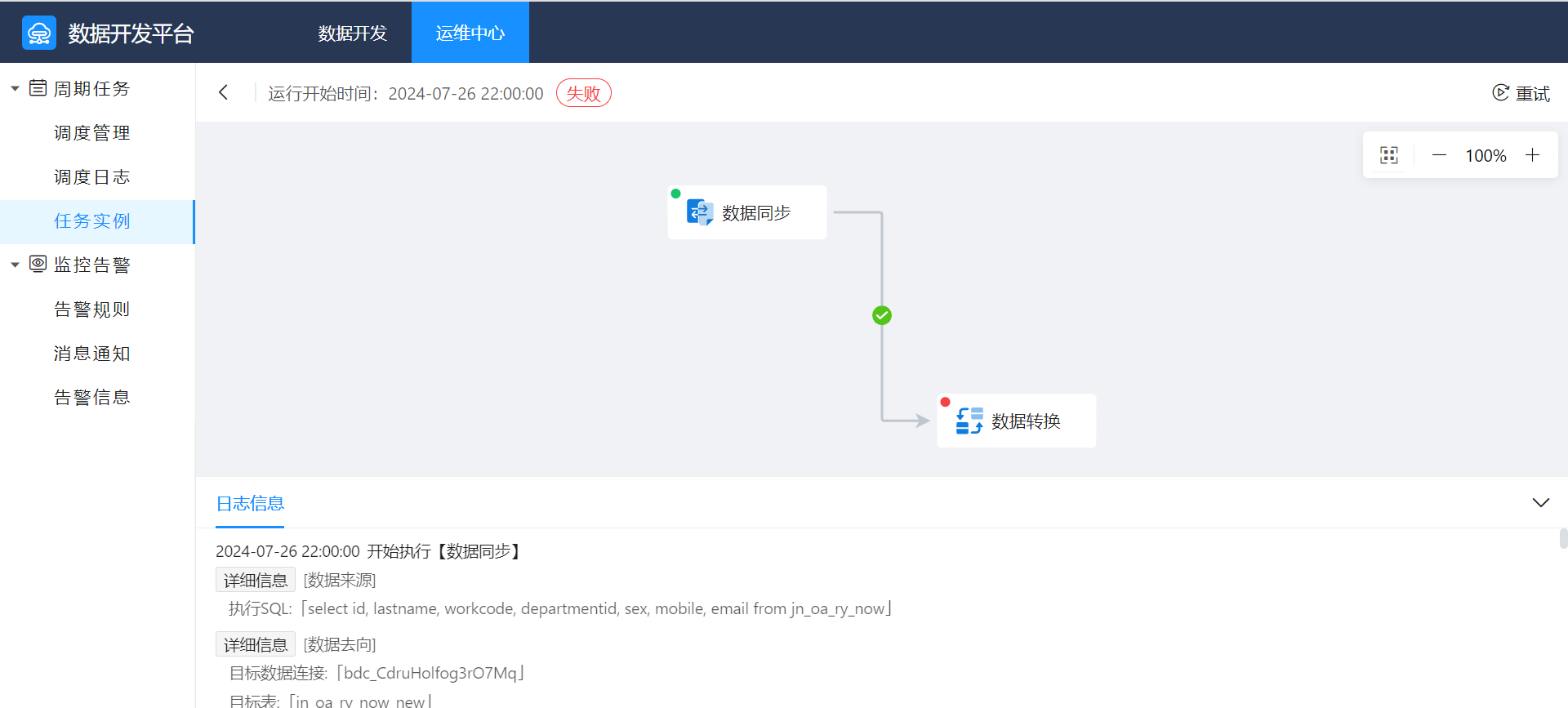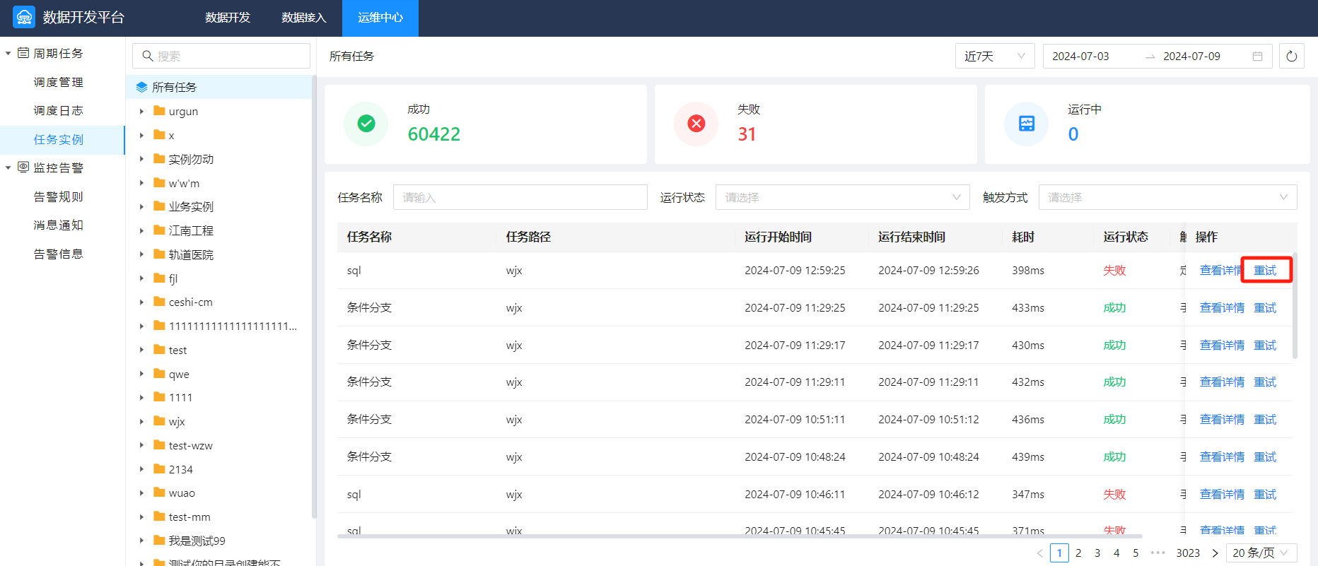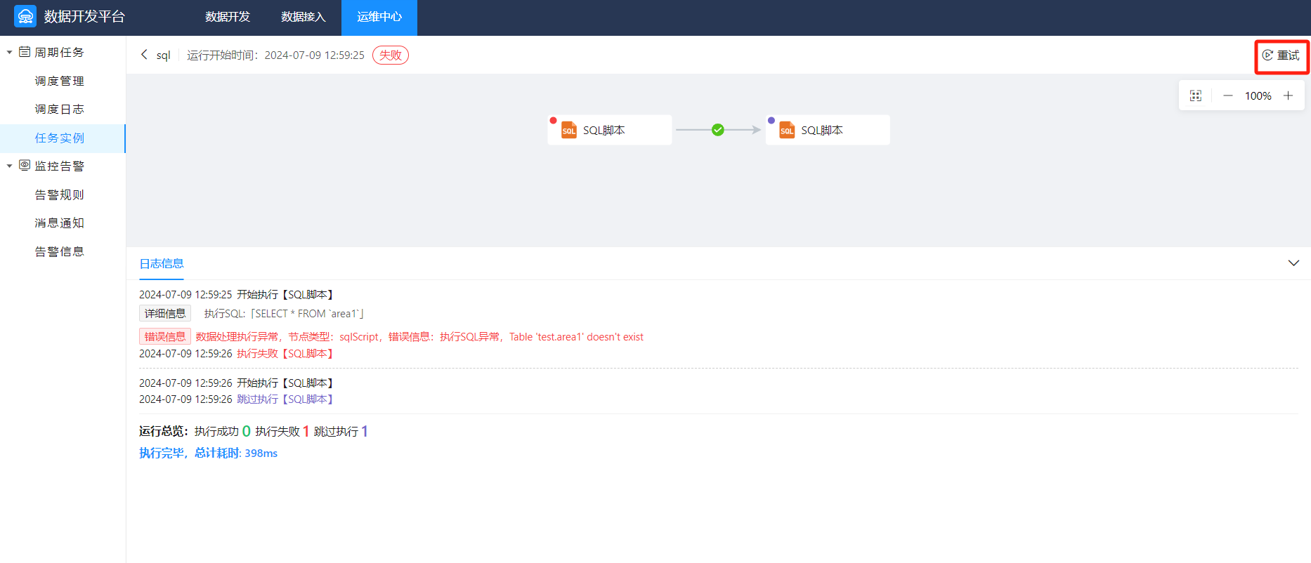 点击「查看详情」按钮后,当次任务运行的日志记录界面中可看到「重试」按钮。