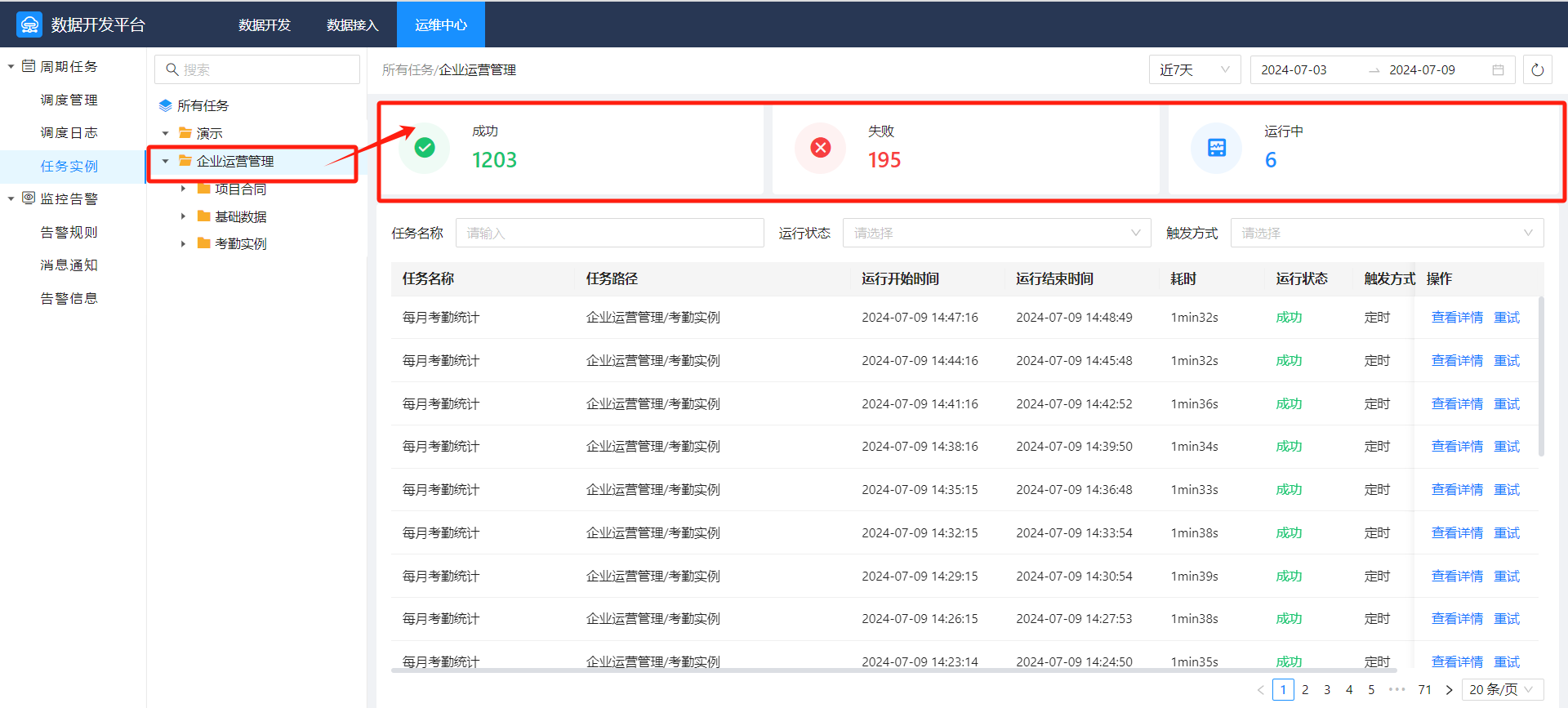 任务实例下展示了当前应用下所有已发布任务的运行情况,包括运行状态、任务耗时、触发方式等。