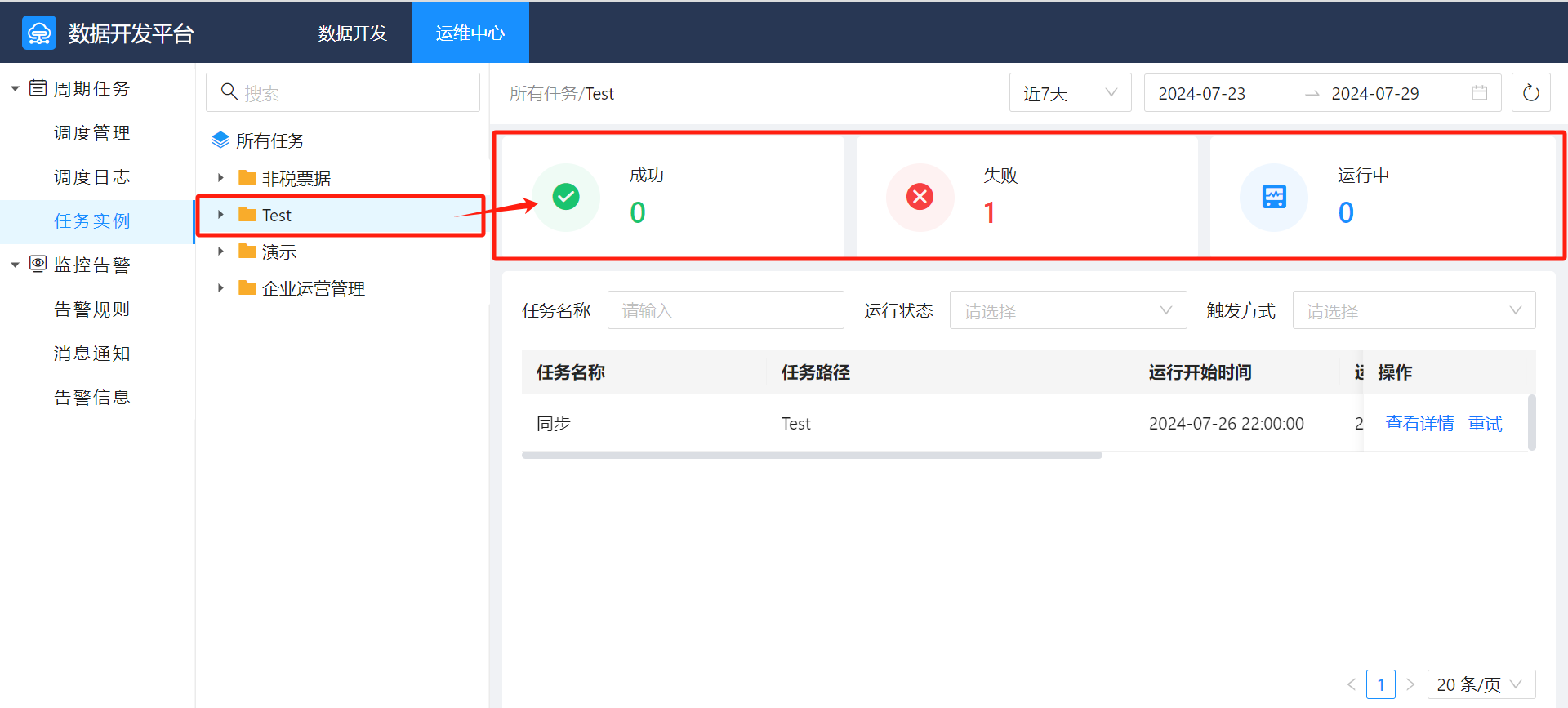 选择指定的任务或者文件夹,即可看到该文件夹下任务的运行情况,包括运行状态、任务耗时、触发方式等。如下图所示: