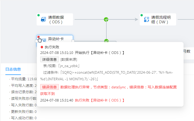 每个节点都会显示运行状态,绿色表示运行成功,红色表示运行失败,紫色表示跳过;鼠标移入节点的状态上可查看该节点的执行日志信息。