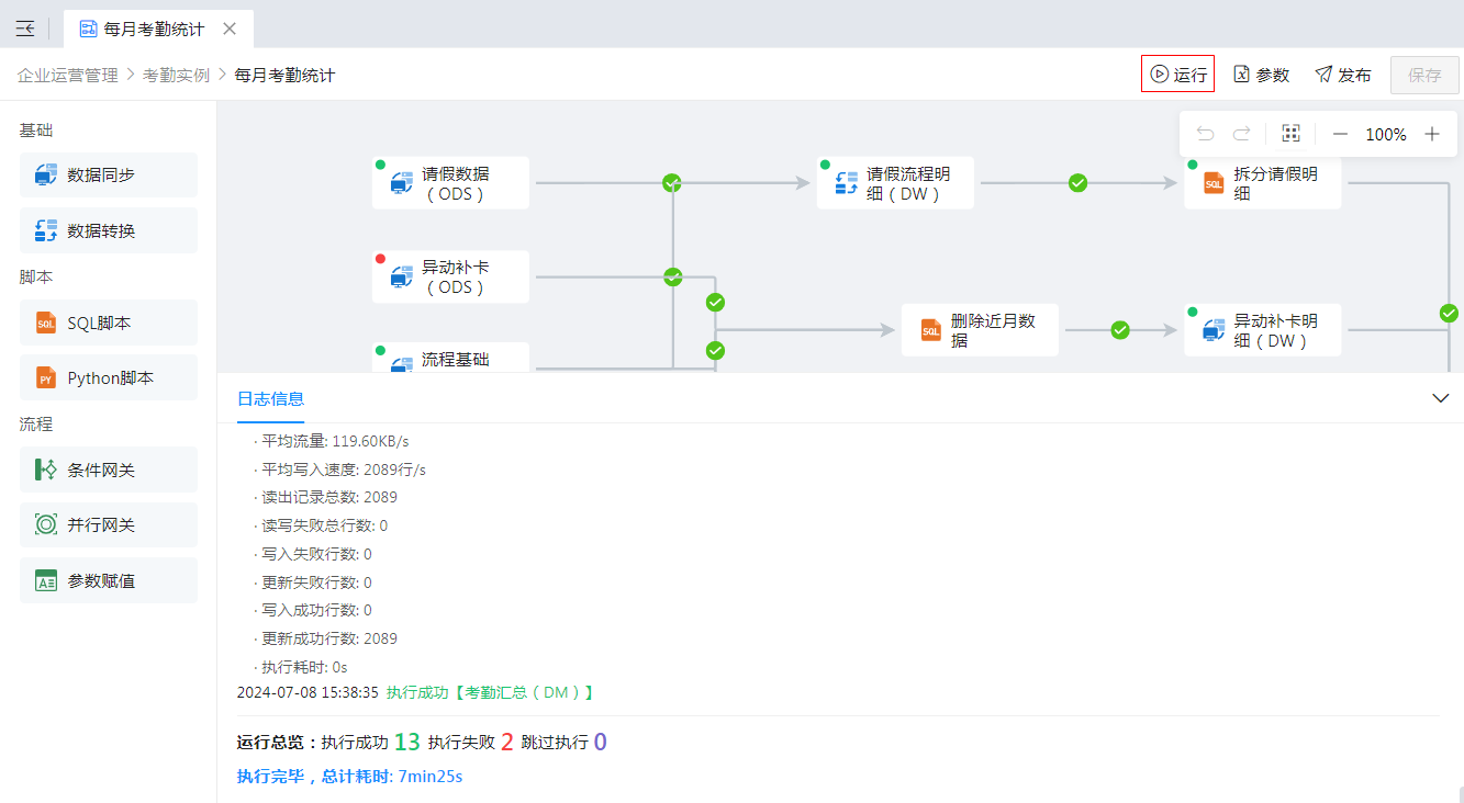 在任务设计首页,点击工具栏上的“运行”可运行整个任务,下方将显示对应的执行日志,显示每个节点运行的日志信息,遇到问题可进行问题排查。