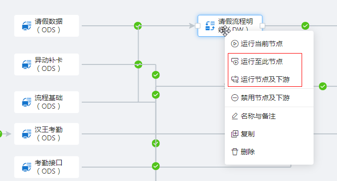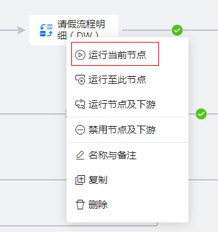 运行节点及下游:点击将从该节点为起始点进行运行,运行该节点以及所有的下游节点。