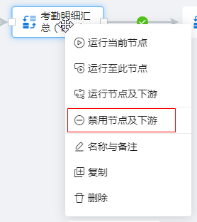 可通过节点右键选择“禁用节点及下游”将调试过程中不需要运行的节点禁用,方便有针对性的查看每条线的运行情况,逐一排查最终找到问题根源。