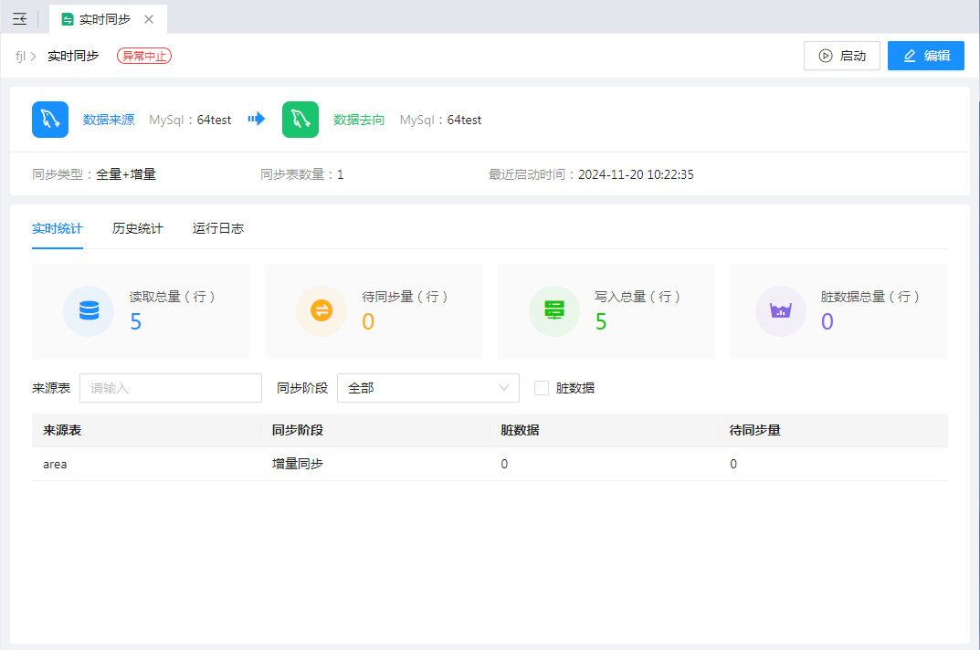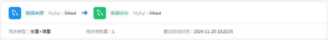 配置完成的任务,可查看该任务的数据来源、数据去向、同步类型、同步表数量(从任务启动至今同步的表总量)、最近启动时间。