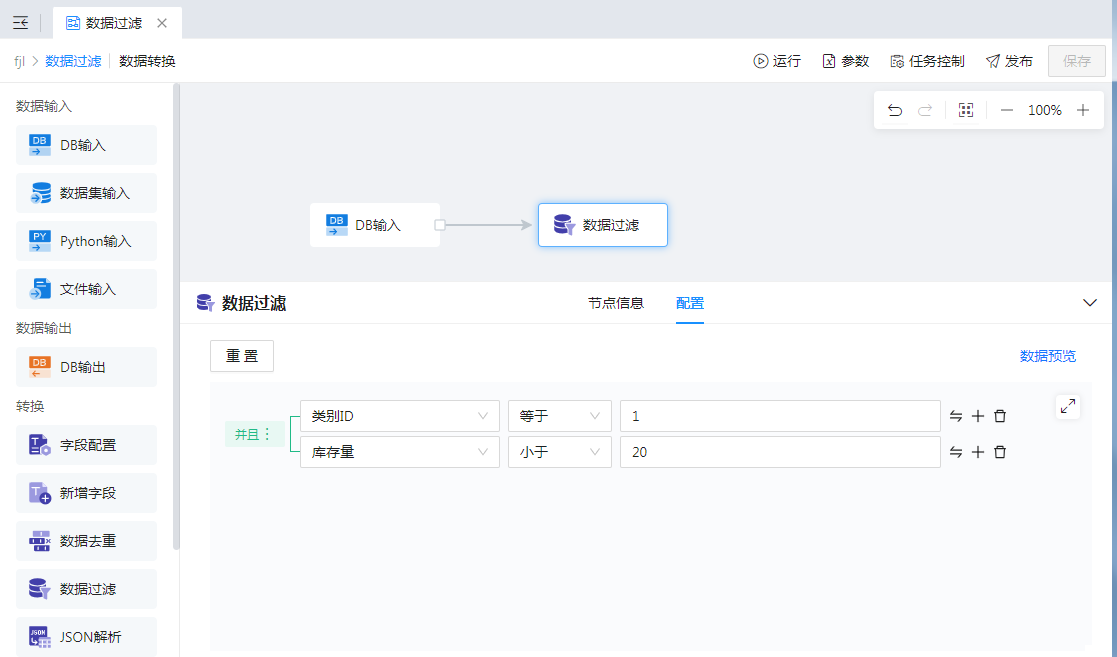 【数据过滤】可对上一个节点数据源数据通过设置过滤条件进行数据过滤。