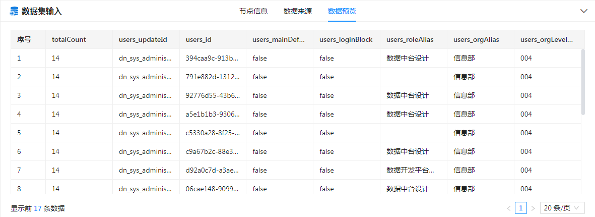 数据来源配置完成后,切换到“数据预览”tab,可查看所有返回字段对应的数据,如下图: