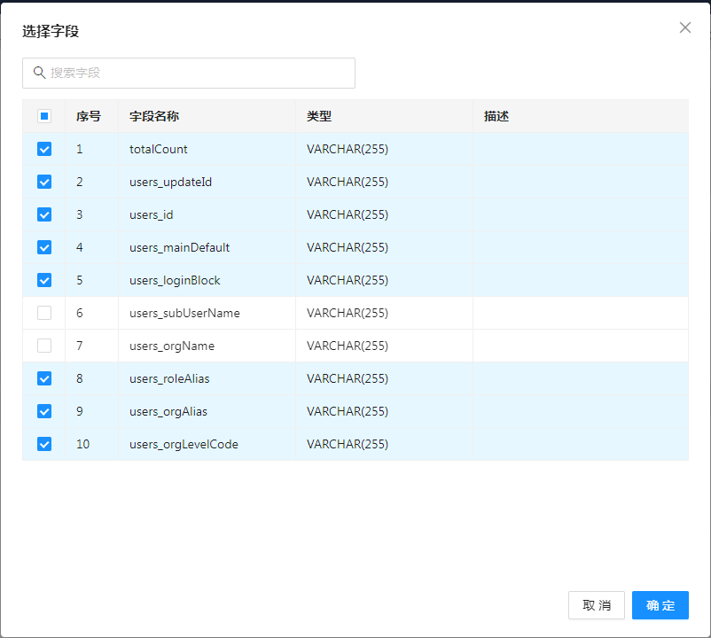 “数据集输入”的取数来源可按需选择返回字段,默认返回全部字段,点击“选择”可配置需要返回的字段,不需要返回的字段,取消勾选即可,比如:不返回字段“users_subUserName”和“users_orgName”。如下图: