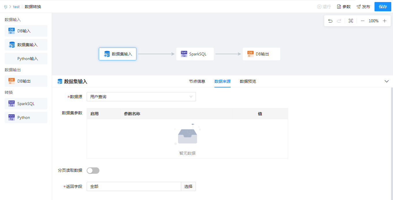 数据中台的数据集输入功能是指从于设计器中配置中配置的数据集读取数据,作为下游处理、分析或服务的输入源。