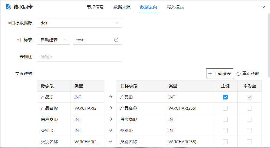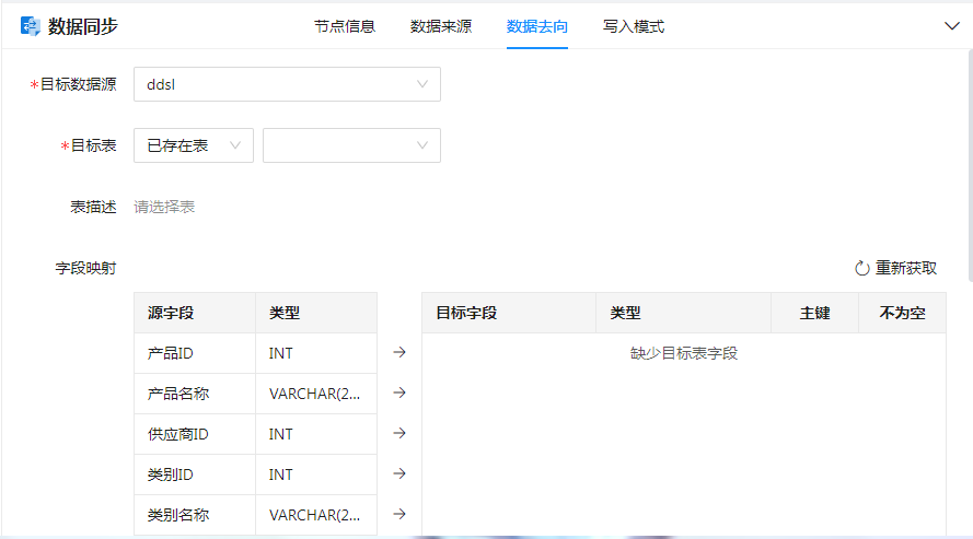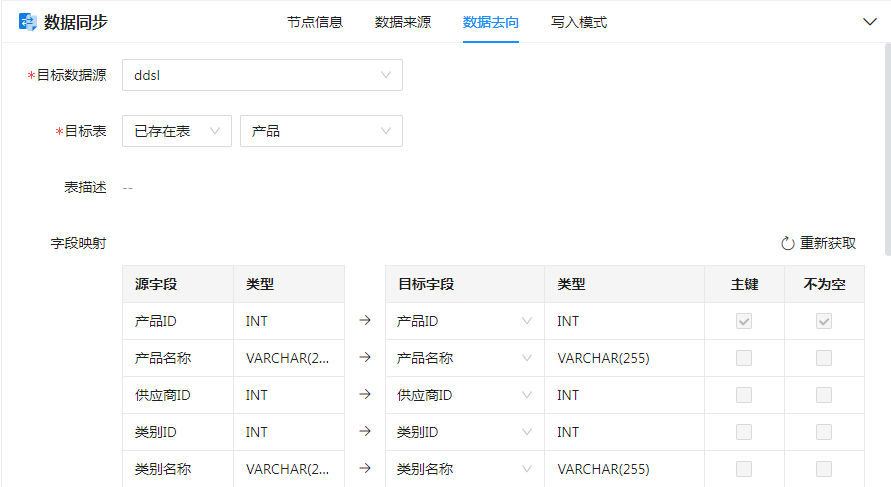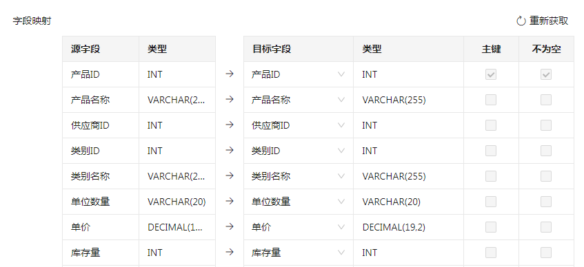 当源表或目标表发生变化时,可点击“重新获取”按钮将重新获取源字段和目标字段,进行重新映射,并更新对应字段名称、字段类型、表描述等信息。