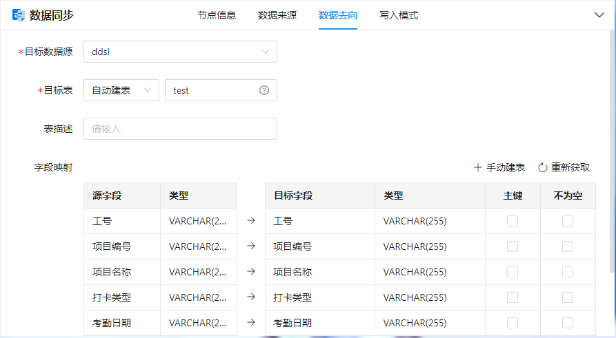 2)当表选择的“自动建表”时,默认将源表对应的字段带入目标字段中,可对其进行如下设置: