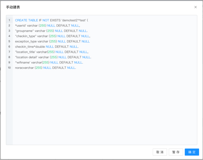 表名、表描述和字段配置(包括字段名称、类型、主键设置、是否不为空)完成后,可点击“手动建表”进入建表界面,如下图: