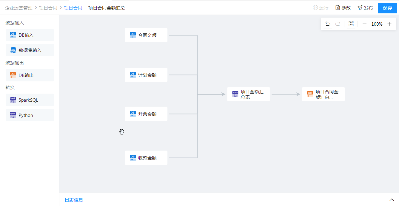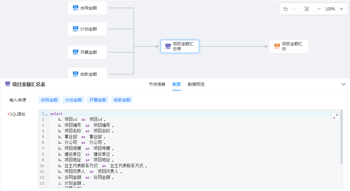 1)增加[SparkSQL]节点“项目金额汇总”,与“合同金额、计划金额、开票金额、收款金额”节点连接,将以上数据汇总在一张明细表中,配置如下图: