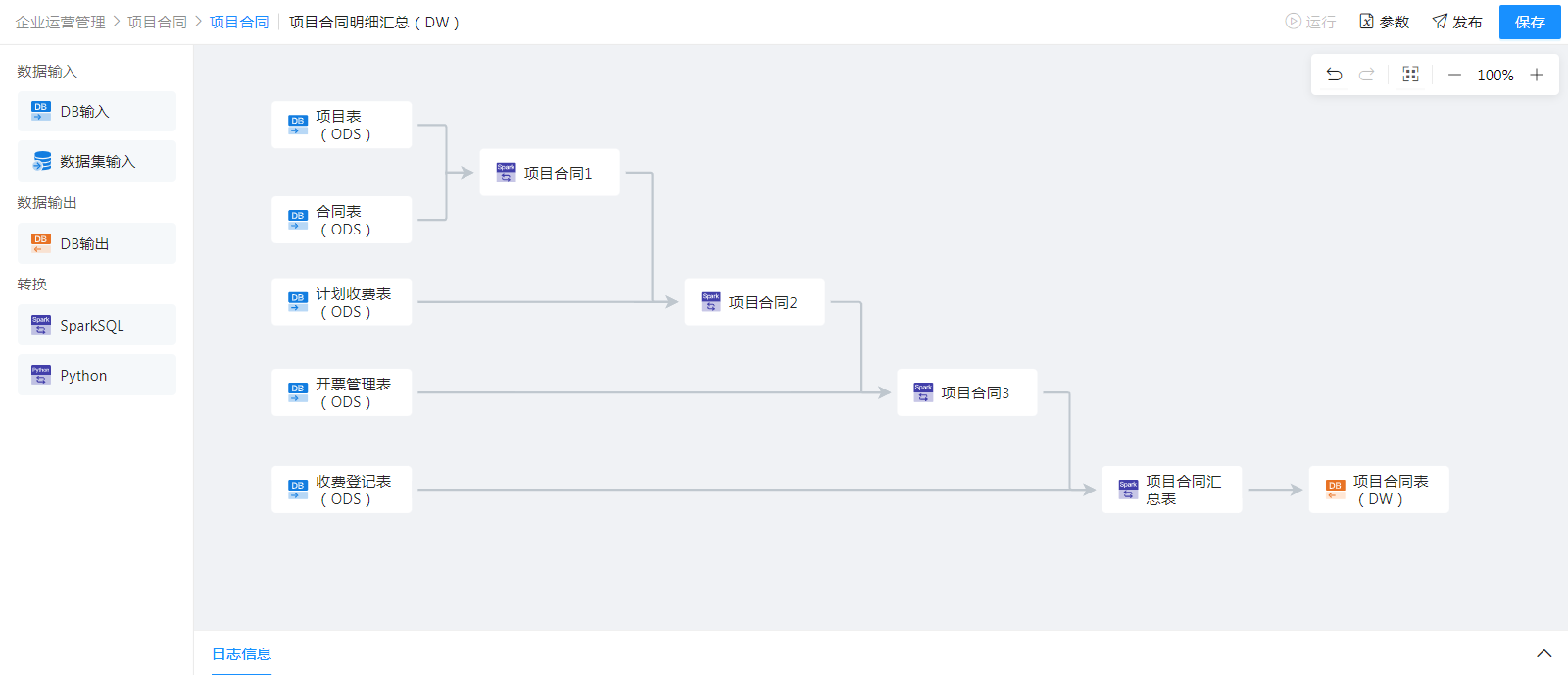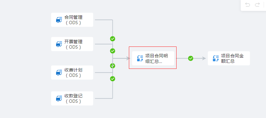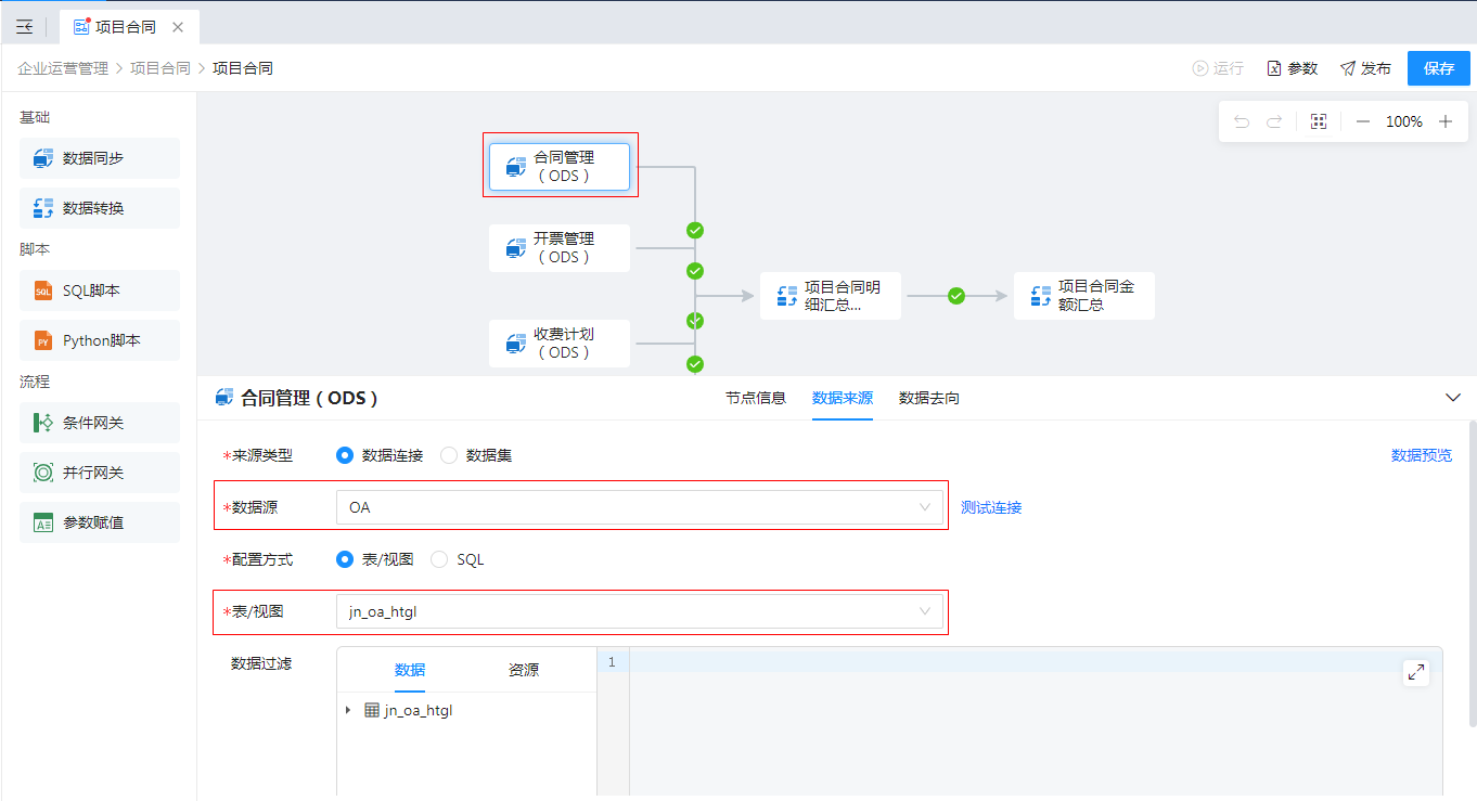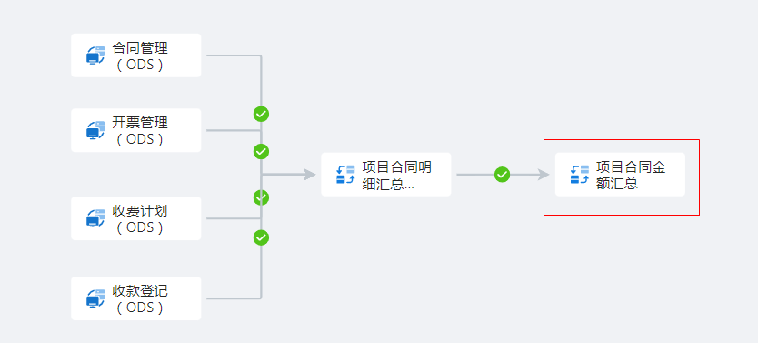 将ODS层的项目管理表(通过“基础数据维护”章节同步至目标库中的数据)、合同管理表、收费计划表、开票管理表、收款登记表进行关联和处理,最终生成“项目合同明细”数据(即DW层)。具体步骤如下: