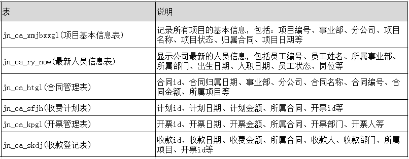 项目合同相关表目前都存储在OA系统同一个数据库中,具体如下: