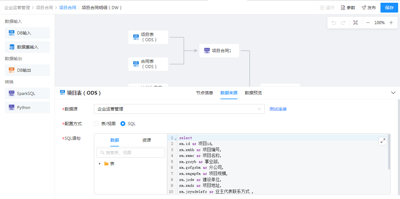 添加“SparkSQL”节点“项目合同1”,与“项目基本信息”、“合同管理”进行连接,将项目和合同信息进行关联,如下图:
