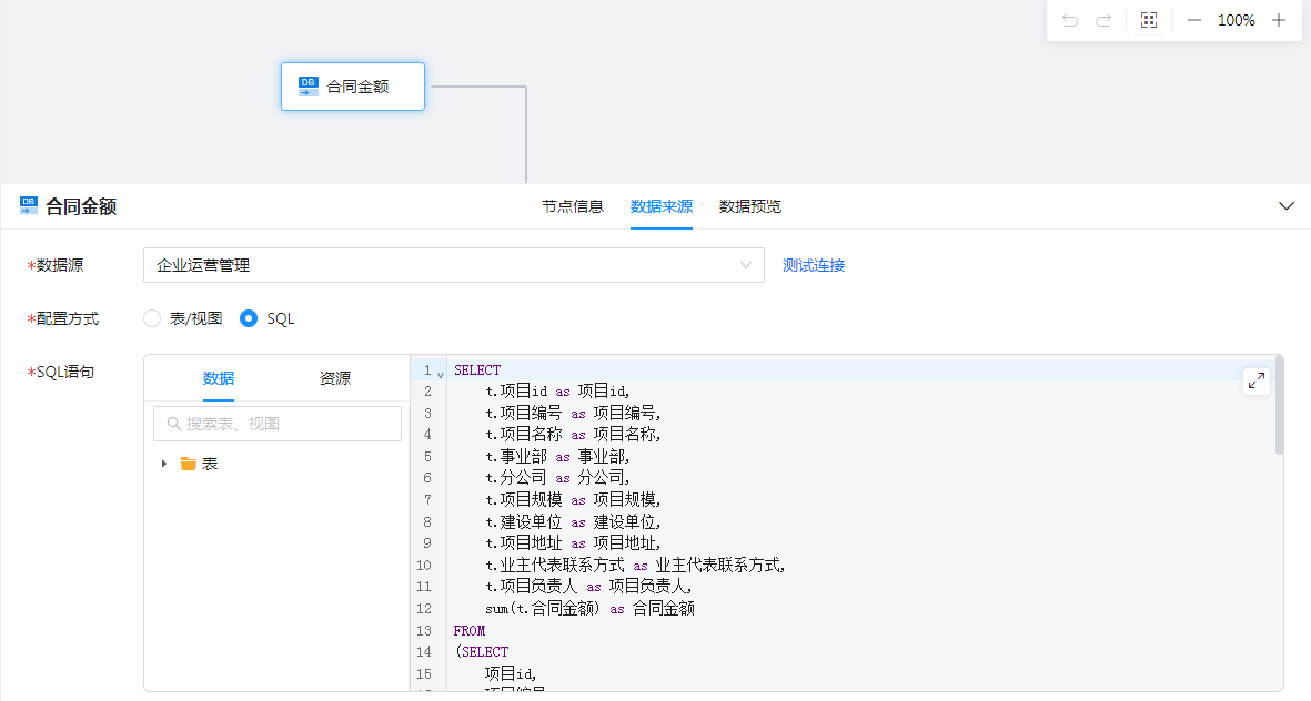 需要将项目合同与项目合同明细进行关联并汇总,所以要使用SQL方式输入对应的SQL语句获取数据。
