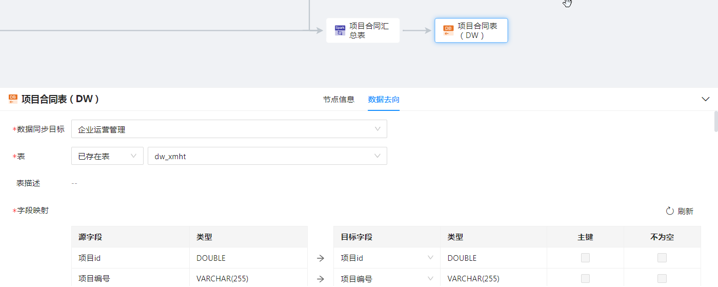 最后需要添加一个“DB输出”节点“项目合同明细”,将处理后的数据输出至qyyy_originaldata 应用库的“dw_xmht”表中,如下图: