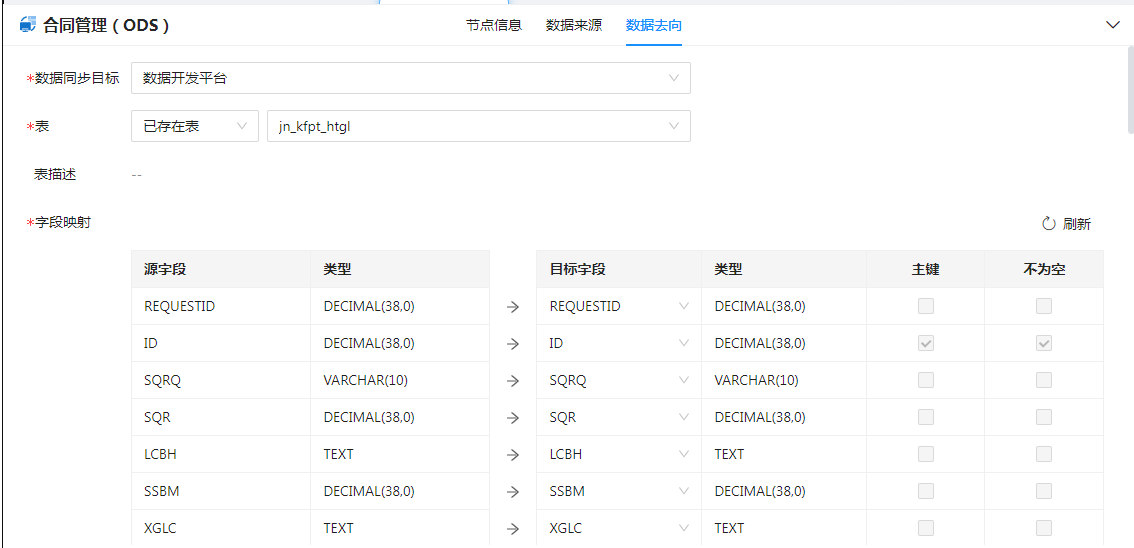 以“合同管理”为例,添加[数据同步]组件,进行数据来源和数据去向配置:
