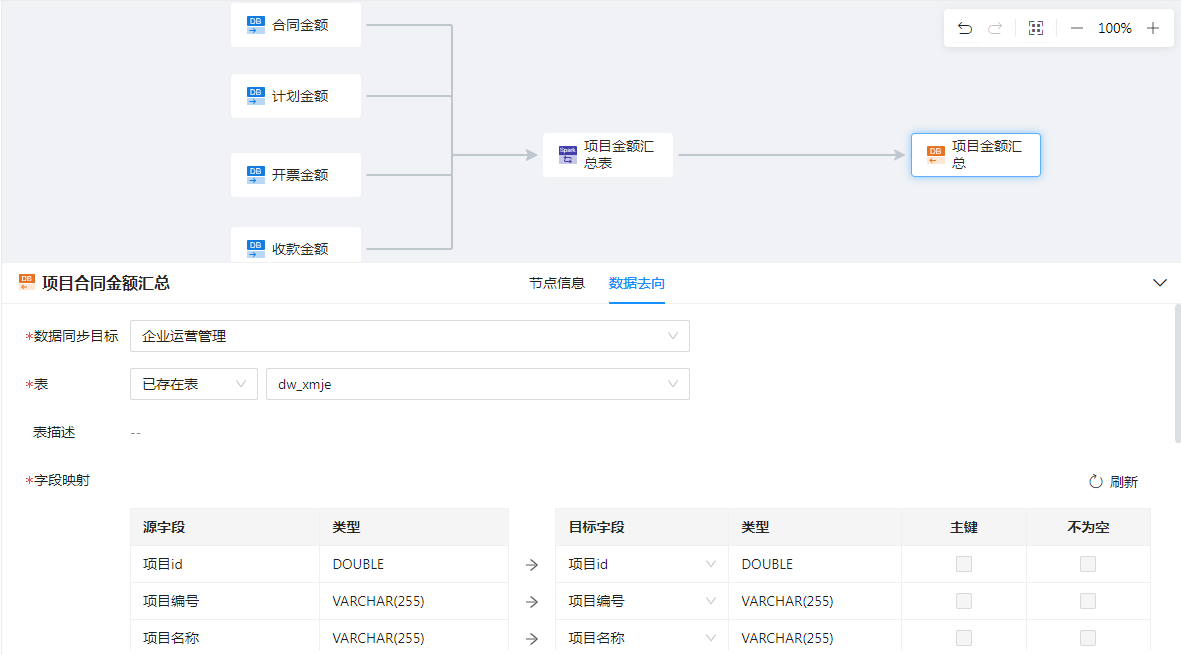 添加[数据转换]节点“项目金额汇总”,与DW层“项目合同明细”节点进行连接,如下图: