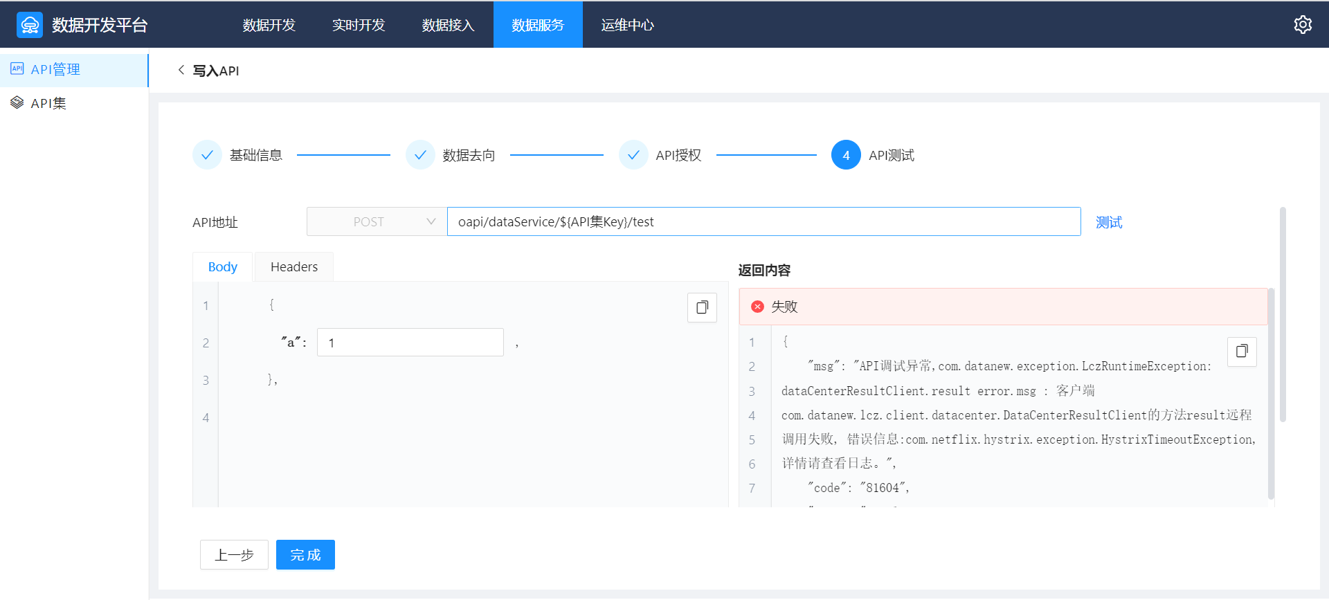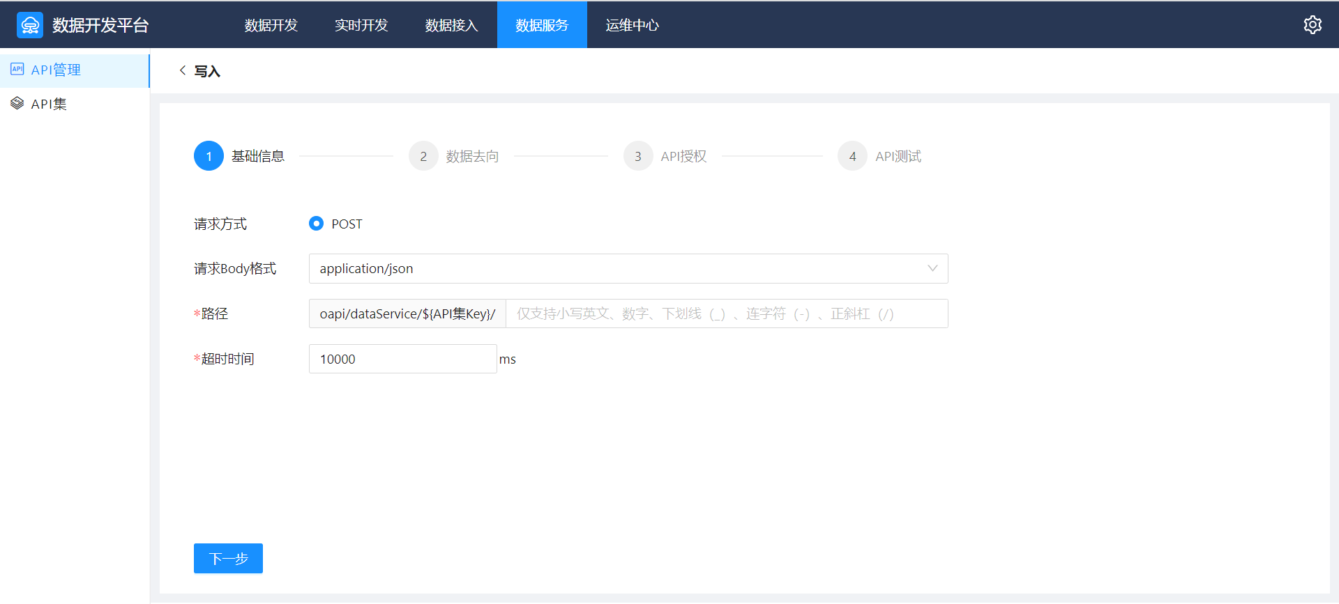 新建一个写入 API 后,需要 4 步即可完成该 API 的设计,具体包括:基本信息、数据去向、API授权、API测试。