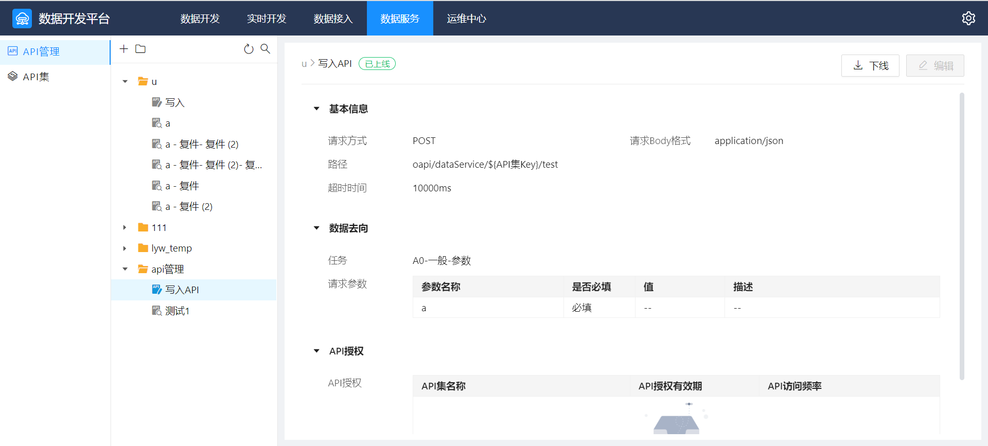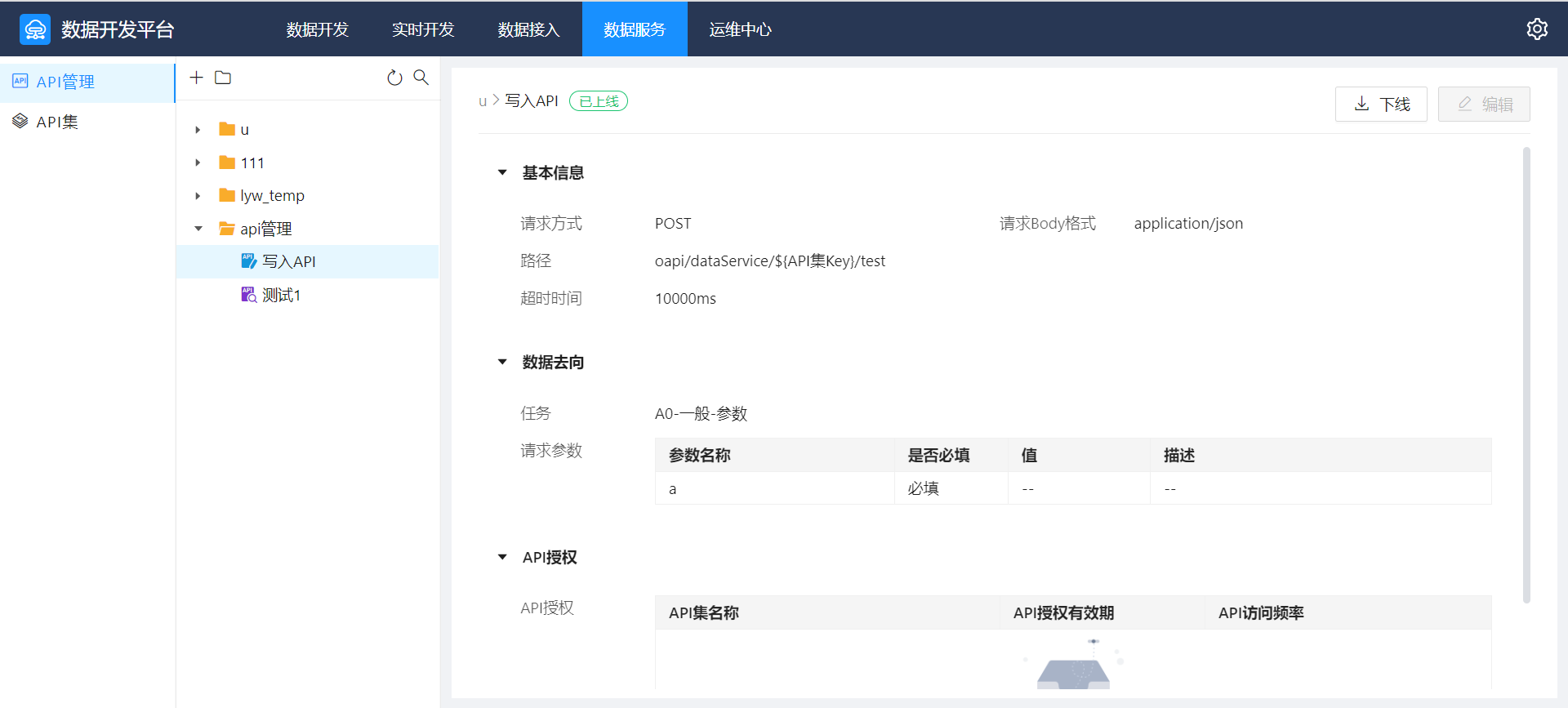 新建的API默认为“下线”状态,在右上角点击“上线”即可将该API上线,有访问权限的外部系统通过对应认证后即可访问该API。