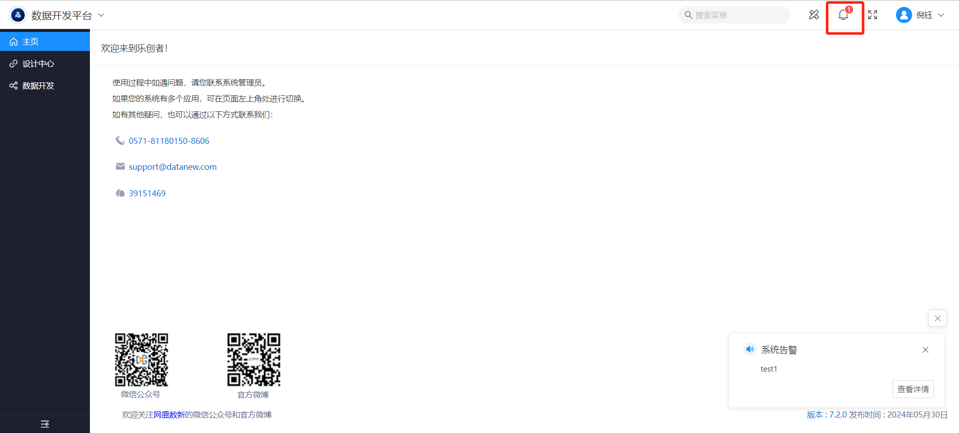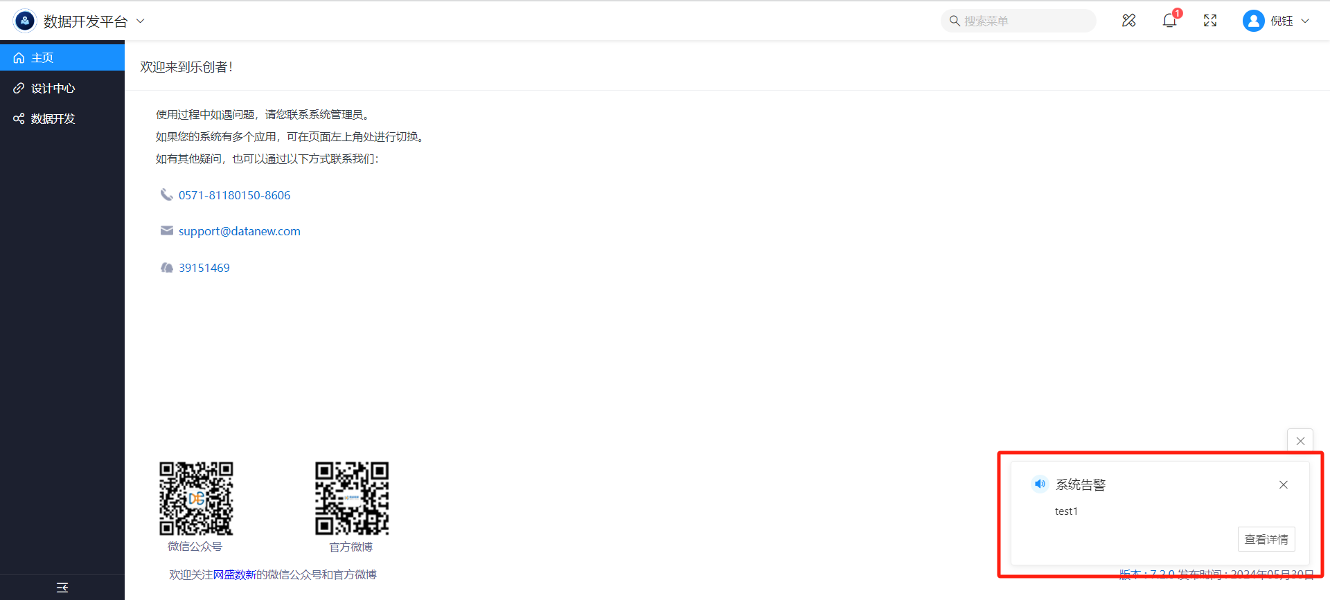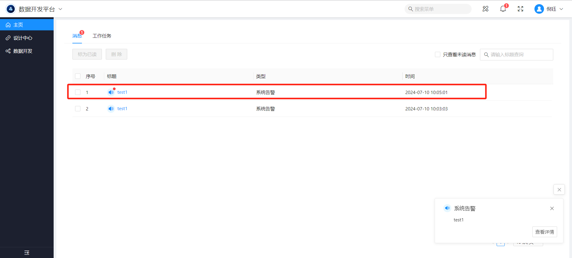 当任务触发告警条件时,将给接收人发送平台消息,接收人登录系统后,右下角将弹出告警信息,如下图: