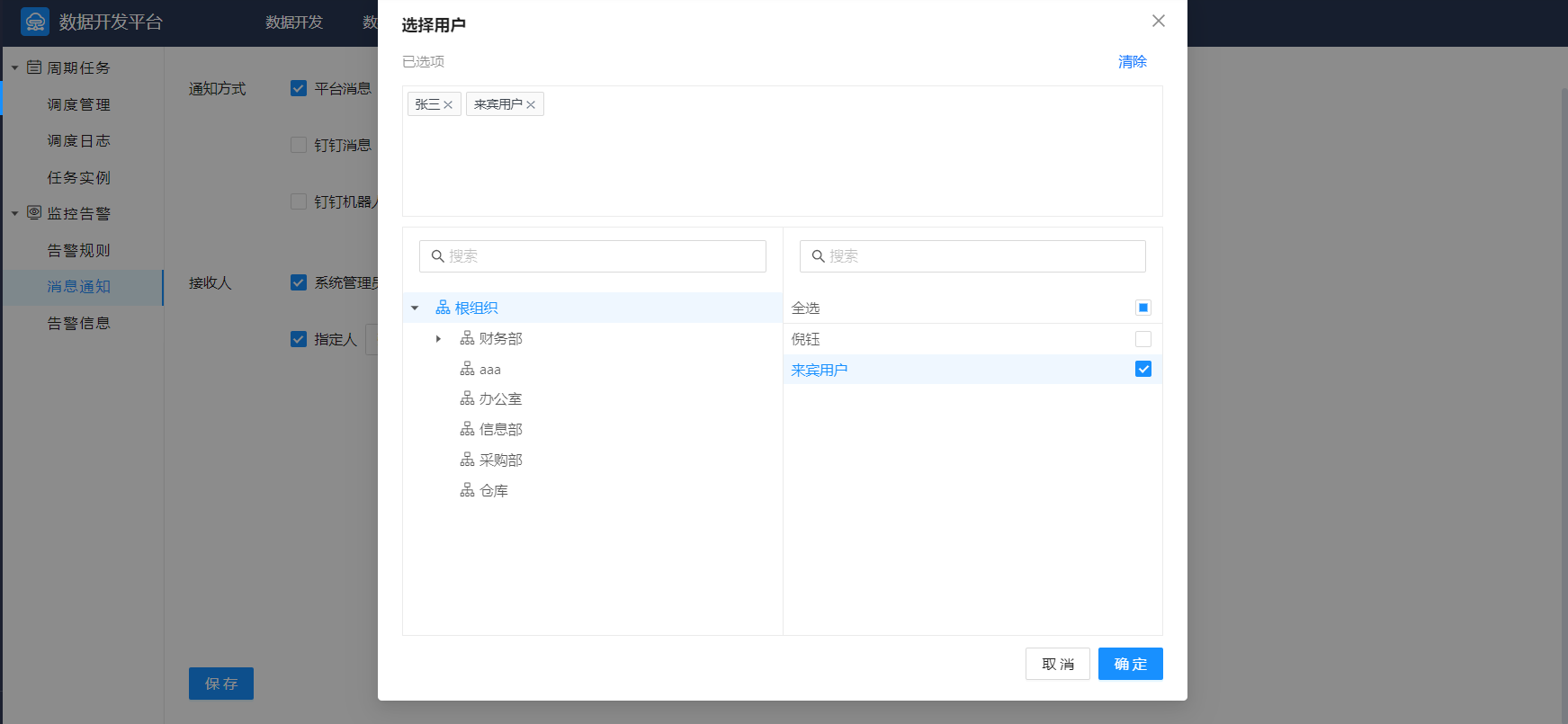 配置之后,通知方式中钉钉消息将使用该租户下的钉钉配置,接收人也将选择该租户下的用户。